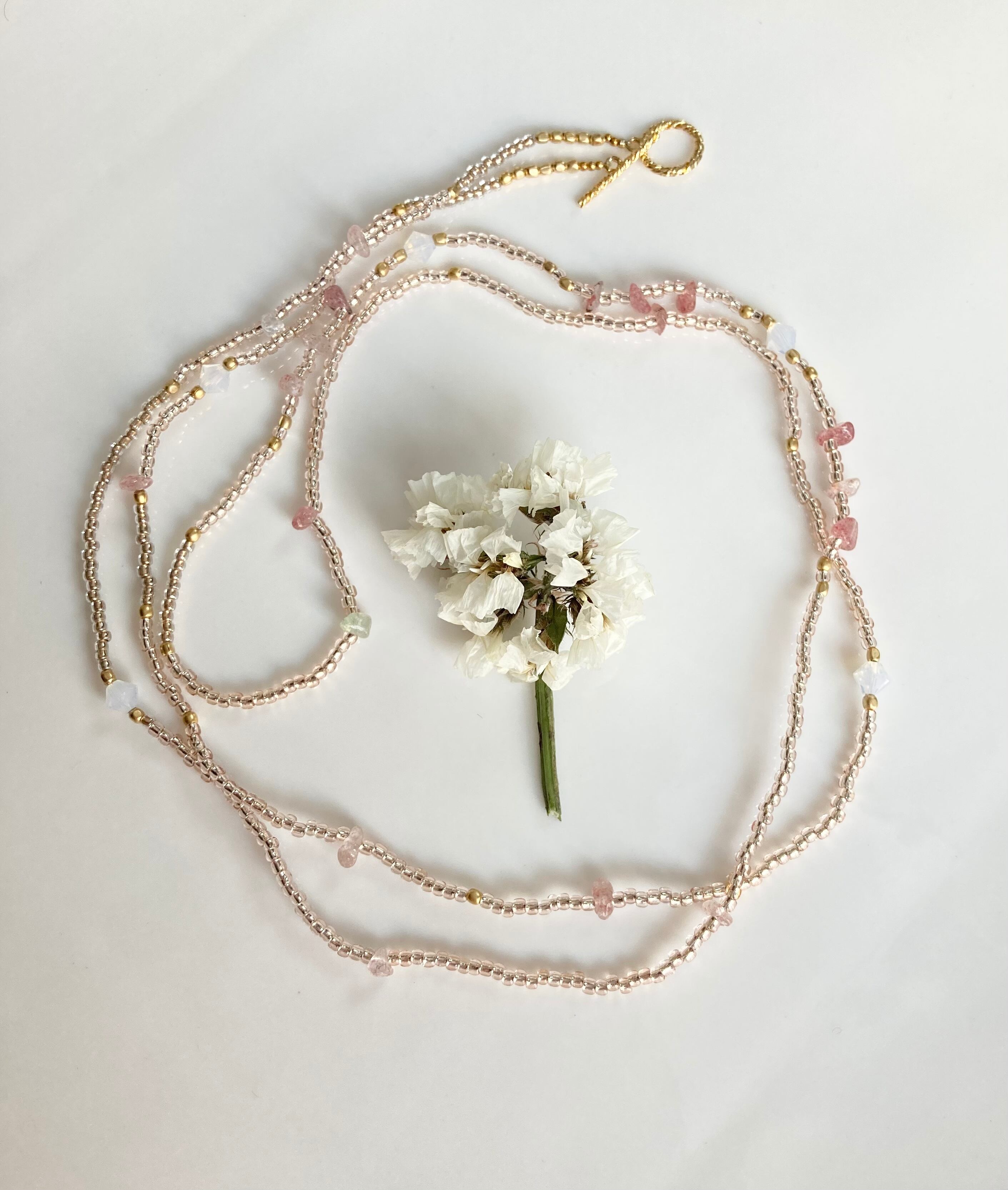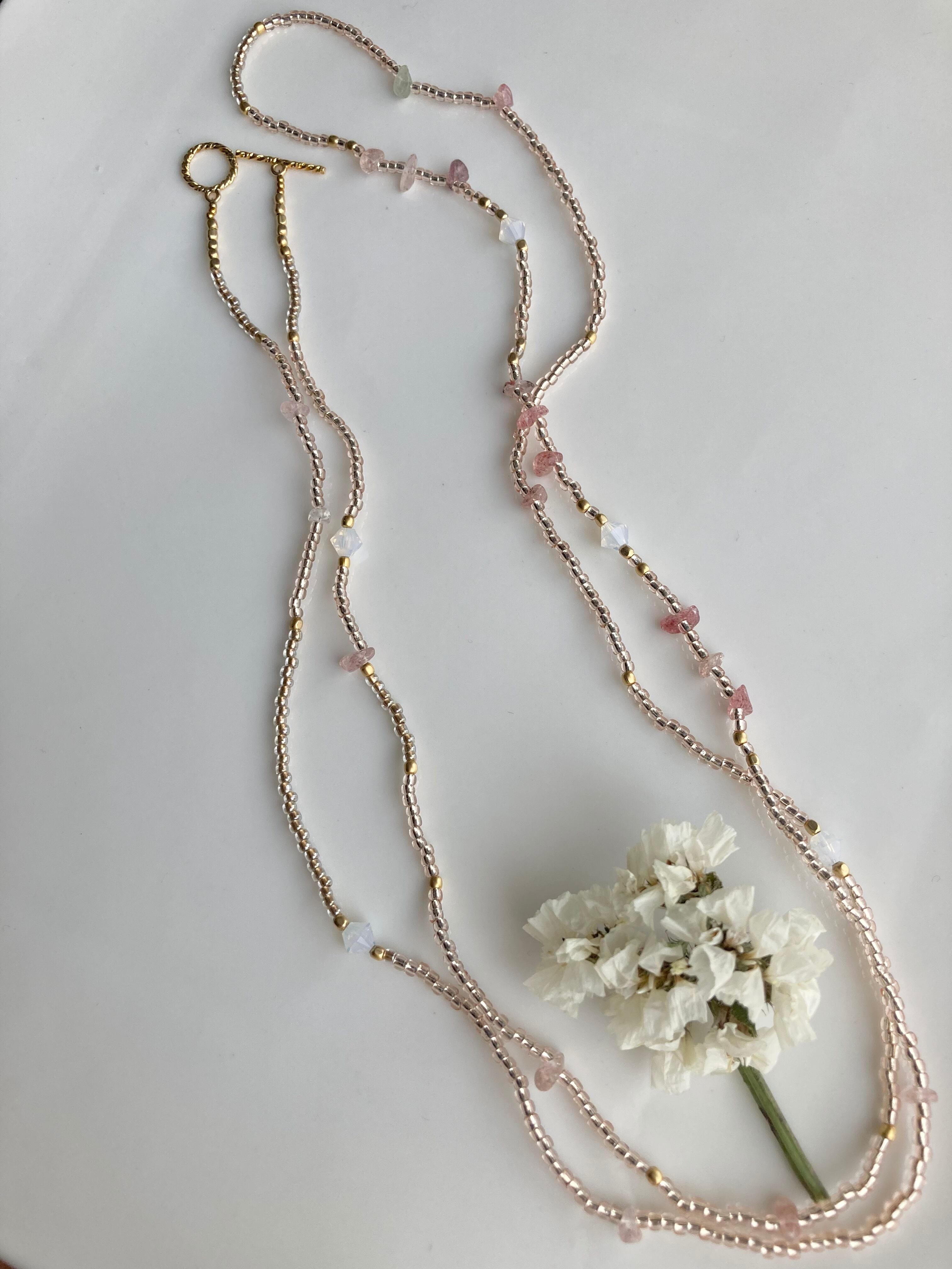 【ライトピンク】天然石とガラスビーズのロングネックレス
